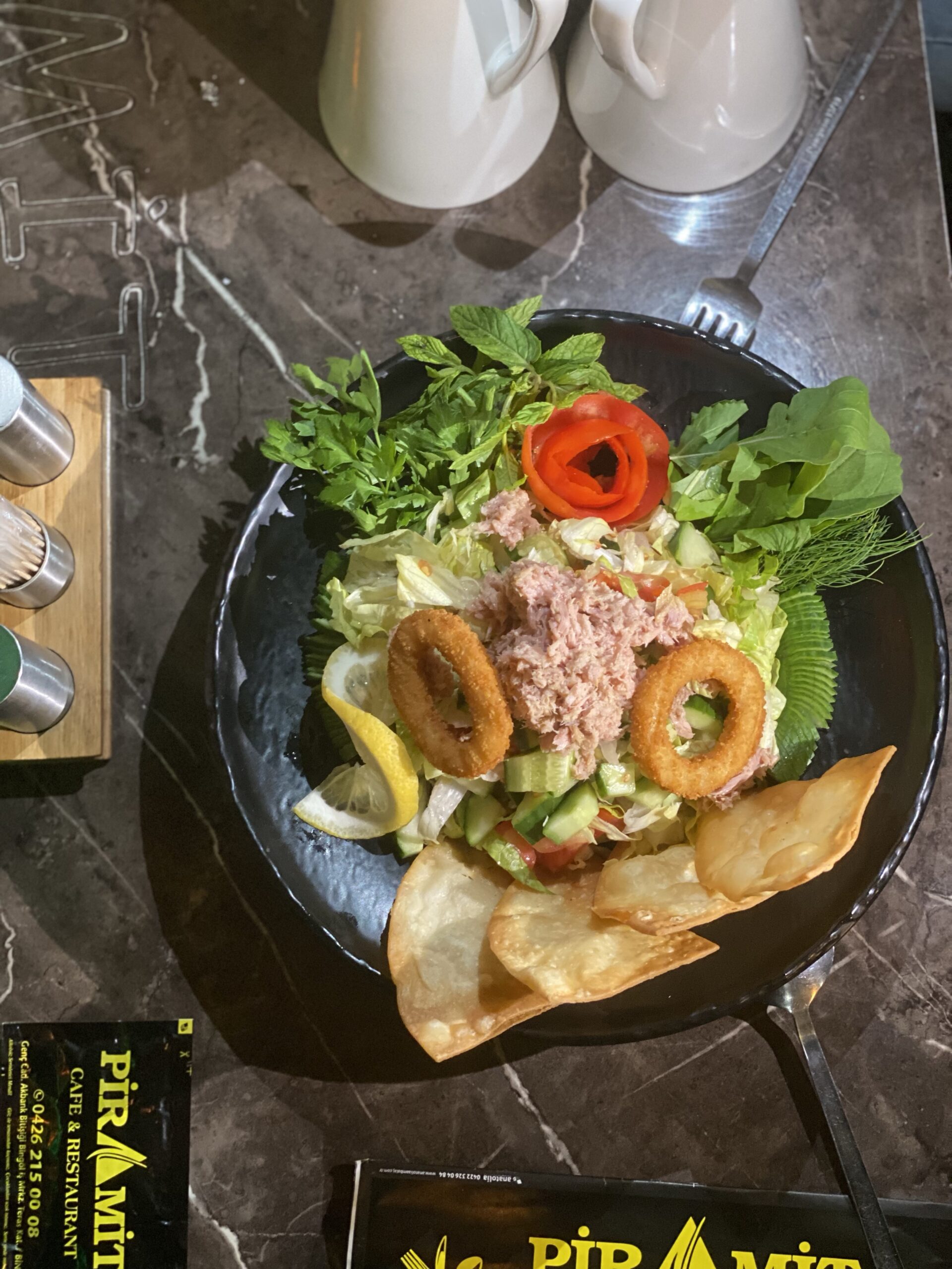 Marolsalatalık,cherry domates,panelenmiş tavuk misir,kornison turşusu eşliğinde